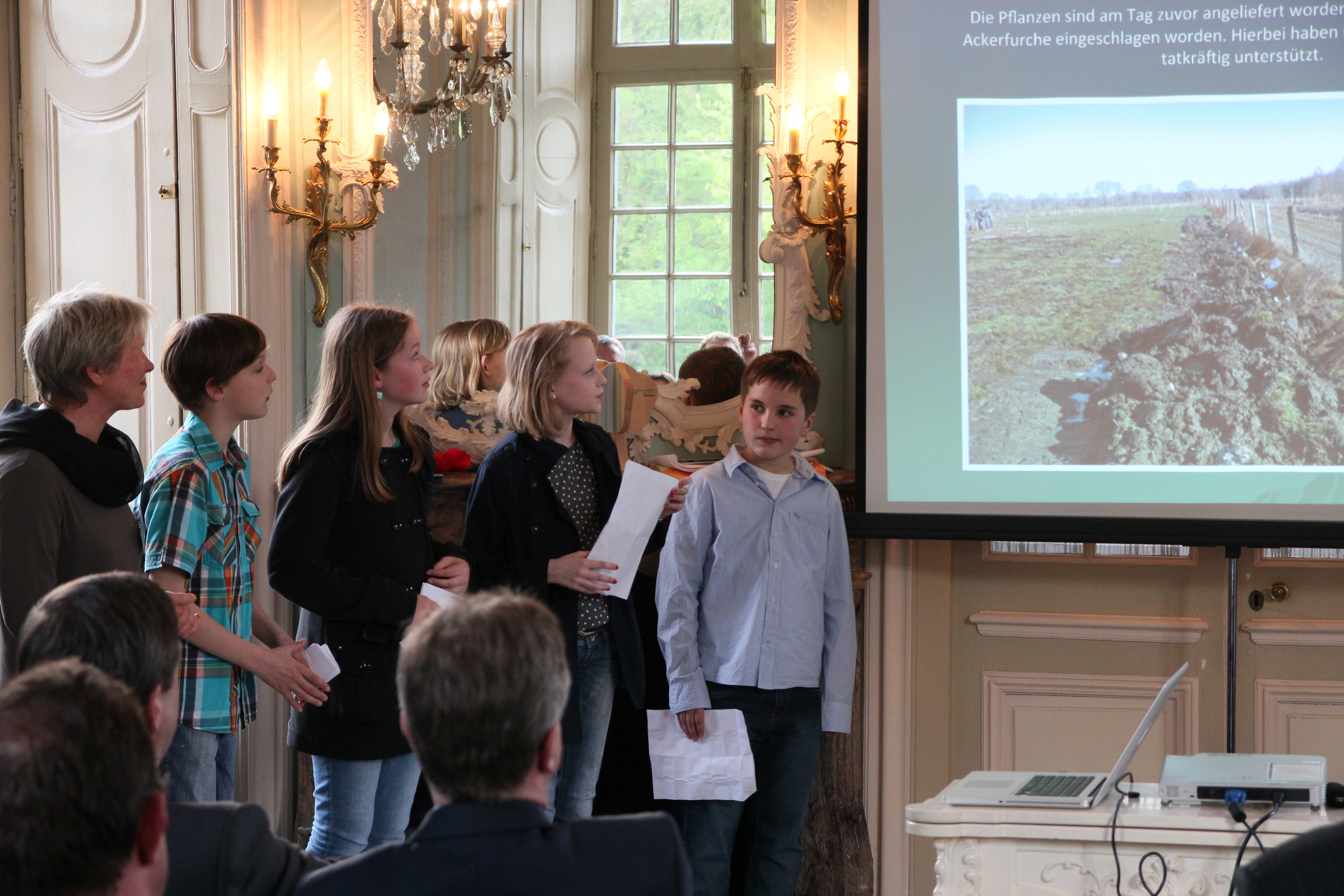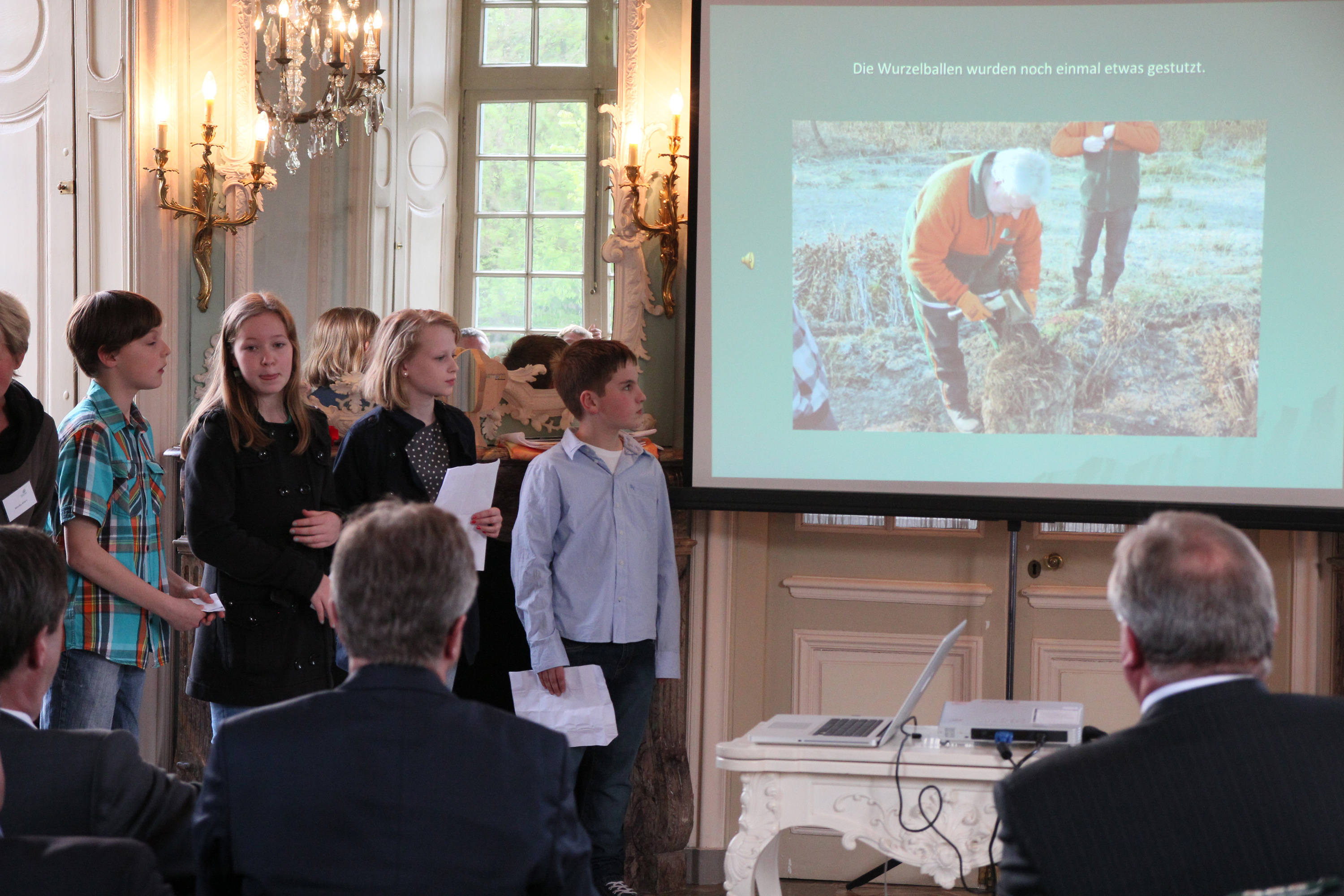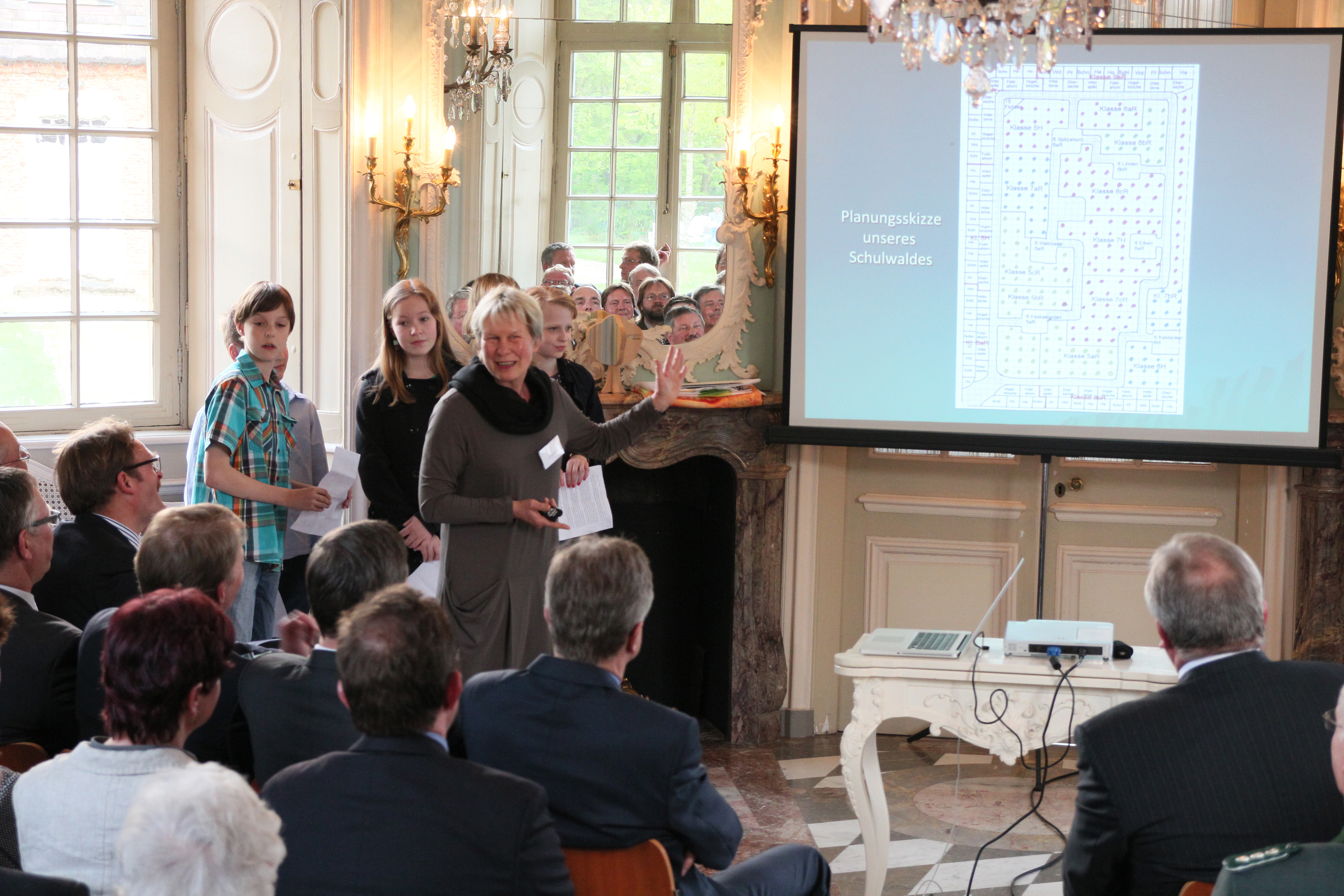 Zusammen mit Franz Hüsing, Direktor der Stiftung Zukunft Wald, überreichte Bernhard van der Ahe, Vorsitzender der Naturschutzstiftung, den Schulleitern Manfred Rojahn (Gymnasium) und Maria Lau (Schule am Schloss) Urkunden. Diese räumen den Schulen laut Hüsing für die nächsten 30 Jahre das Recht, aber auch die Pflicht ein, das Thema Wald in den Unterricht einzubauen . Dazu dürfen die Schulen die Fläche für den Unterricht nutzen.