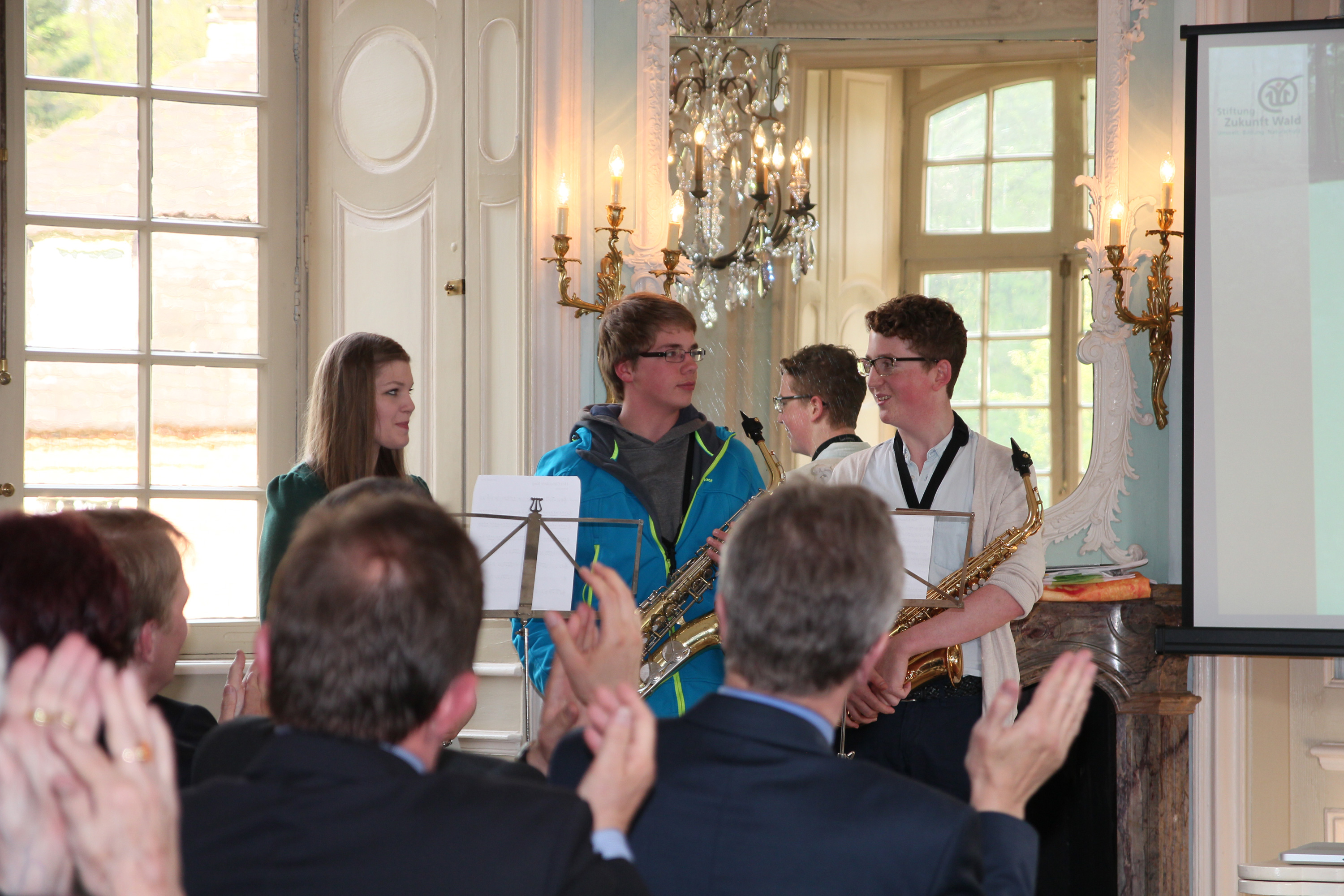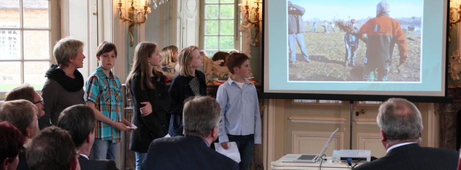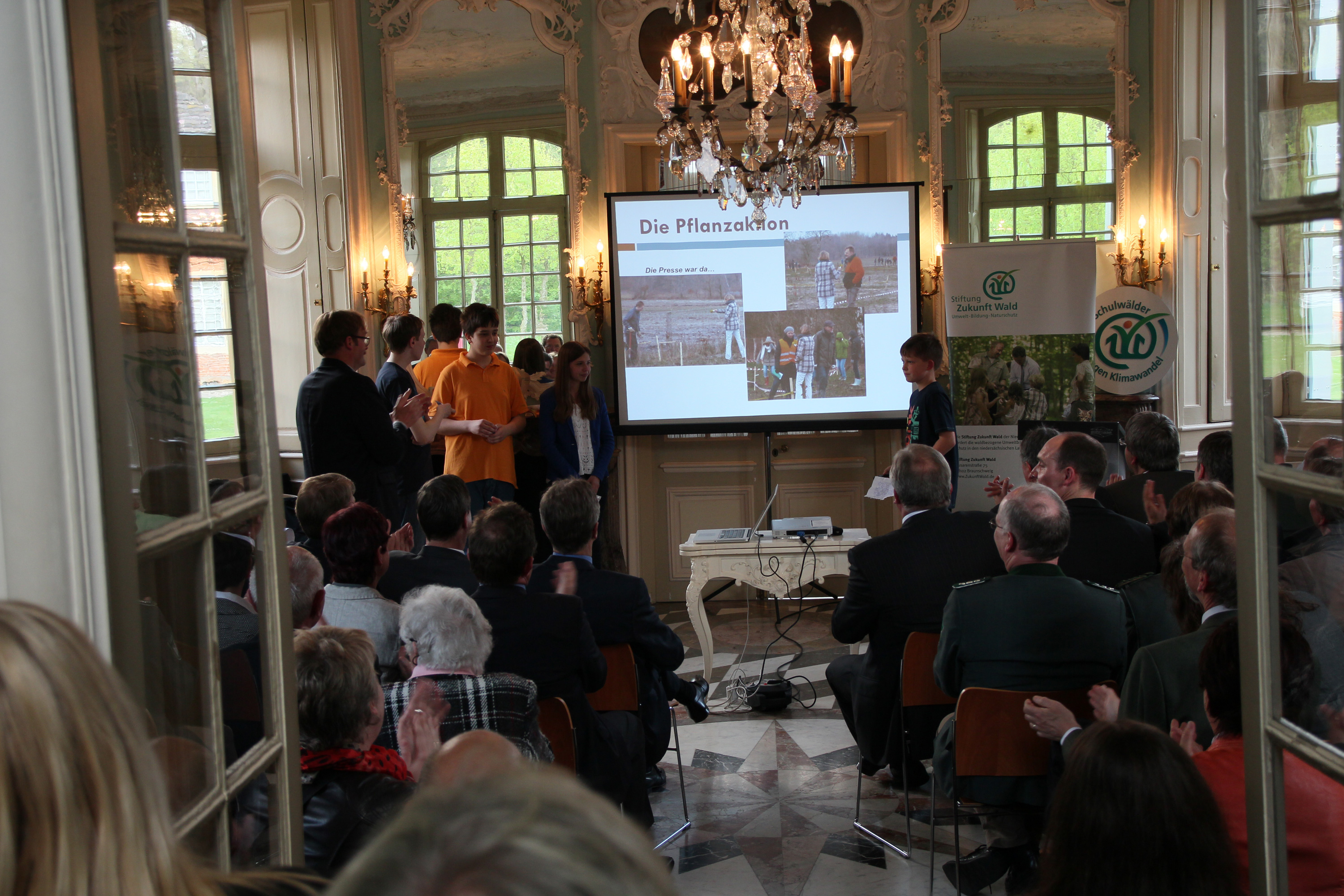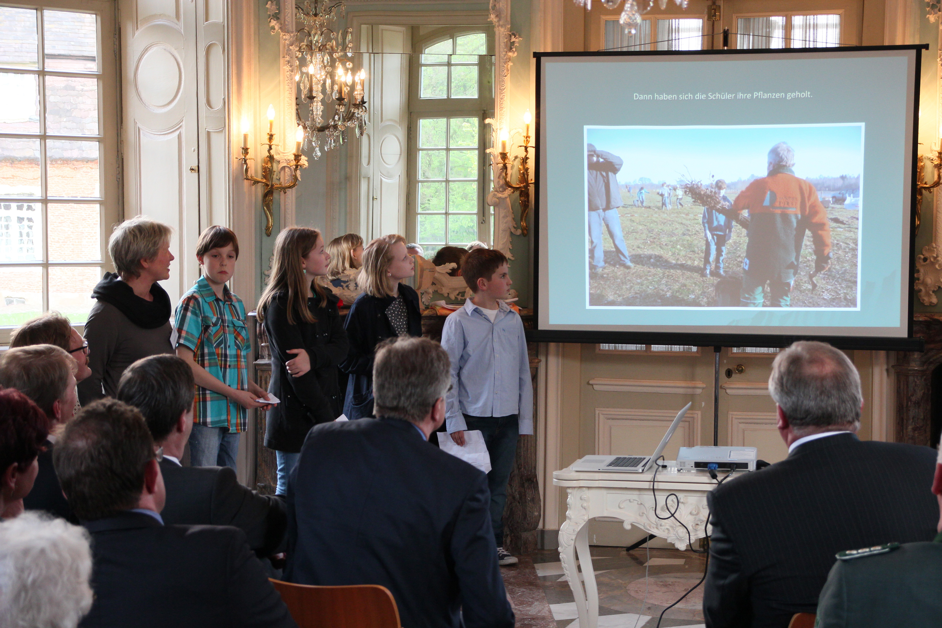 Zusammen mit Franz Hüsing, Direktor der Stiftung Zukunft Wald, überreichte Bernhard van der Ahe, Vorsitzender der Naturschutzstiftung, den Schulleitern Manfred Rojahn (Gymnasium) und Maria Lau (Schule am Schloss) Urkunden. Diese räumen den Schulen laut Hüsing für die nächsten 30 Jahre das Recht, aber auch die Pflicht ein, das Thema Wald in den Unterricht einzubauen . Dazu dürfen die Schulen die Fläche für den Unterricht nutzen.