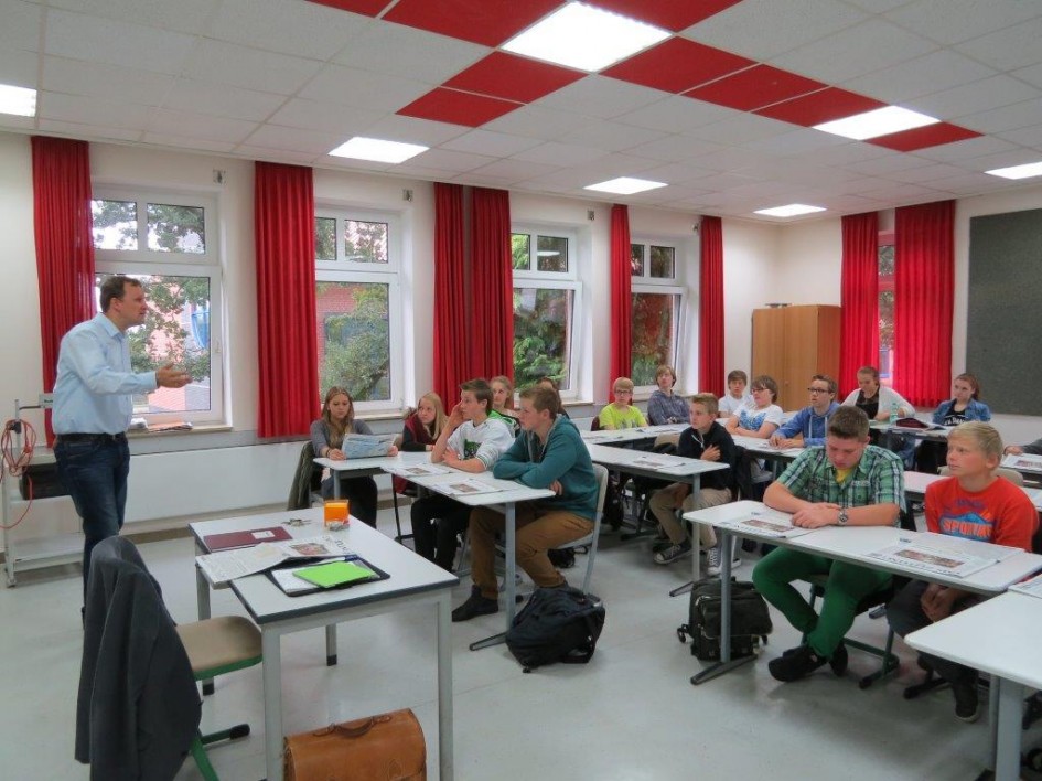 Lehrer Jürgen Jansen von der Schule am Schloss – Oberschule Sögel – verschaffte der Realschulklasse 9 ein Erlebnis von Europa, indem er den Sögeler Jens Gieseke einlud, im Fach Politische Bildung l Unterricht zu gestalten über die Europäische Union. Jens Gieseke ist seit zwölf Jahren in Brüssel tätig und bewirbt sich um einen Sitz im Europäischen Parlament. So erläuterte er zunächst die Aufgaben der europäischen Verwaltung sowie des Europaparlaments. Dabei wurde deutlich, dass die Mehrzahl der Vorschriften, die viele Lebensbereiche der Europäer regeln, nicht von den nationalen Parlamenten und Regierungen beschlossen werden, sondern vom Europaparlament, der Europäischen Kommission und dem Ministerrat. Ausgearbeitet werden diese von der europäischen Verwaltung.