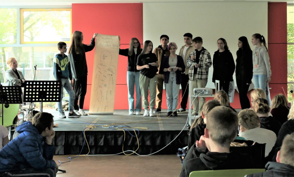 Schulleiterin Maria Lau bedankte sich bei den SchülerInnen und Lehrkräften für das großartige Engagement während der Projekttage und fügte hinzu: „Wir fühlen uns als Schule ohne Rassismus und Schule mit Courage selbstverständlich auch weiterhin verpflichtet, uns für ein respektvolles Miteinander einzusetzen und uns gegen Ausgrenzungen jeglicher Art zu engagieren“.