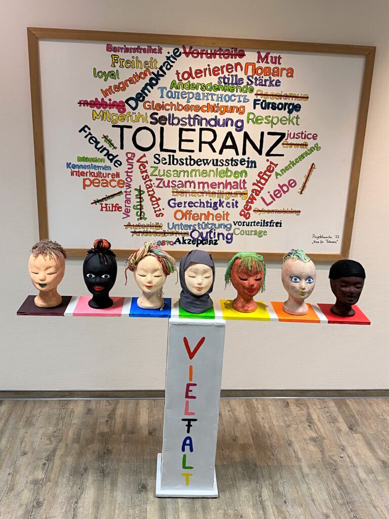 Als ´Schule ohne Rassismus und Schule mit Courage` setzten diese die Thematik „Abenteuer Vielfalt: füreinander – miteinander“ gemeinsam mit ihren LehrerInnen in unterschiedlichen Projekten in die Realität um. Eifrig und mit großem Interesse legten sich die SchülerInnen an drei Tagen handwerklich, künstlerisch, musikalisch oder szenisch ins Zeug, um dann die Ergebnisse ihrer Projekte vor ca. 600 Schülern und Lehrern in der Schulmensa und Pausenhalle der Oberschule zu präsentieren. Zum Einstieg gab es ein Theaterstück, bei dem SchülerInnen ausgrenzende Erlebnisse nachstellten.