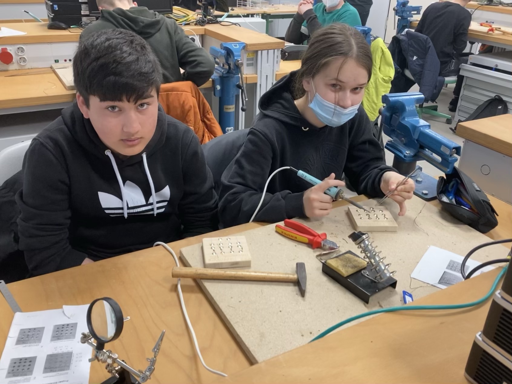 Bohren, Sägen, Hämmern und Löten stand in der letzten Woche für viele Achtklässler auf dem Stundenplan. Aber nicht nur handwerkliche Arbeitsprozesse, sondern auch Programmieren und typische Tätigkeiten aus den Pflegeberufen, aus dem Einzelhandel und aus dem Bereich Dienstleistung lernten die Schülerinnen und Schüler der Oberschule Sögel während der Profilfachfindungswoche an der BBS Papenburg kennen. Aufgeteilt in verschiedenen Modulen wie Elektrotechnik, Metalltechnik, Wirtschaft, Gesundheit und Soziales sowie Bau- und Holztechnik erprobten die Schüler verschiedene Arbeitsprozesse und Tätigkeiten, die für diese Berufsfelder typisch sind und konnten somit wichtige Einblicke in die Berufswelt bekommen.
