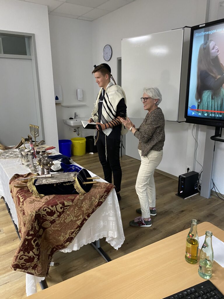Einem Schüler wurden in jeder Klasse symbolisch die Gegenstände für ein Gebet – Tefelin (Gebetsriemen) und Tallit (Gebetsschal) angelegt: Männliche Juden wickeln den Tefelin siebenmal um den Arm und dann dreimal um Hand und den Mittelfinger. Zu dem Tefillin gehören auch Gebetskapseln, die in der Nähe des Herzens und auf der Stirn getragen werden. In den Kapseln befinden sich Texte aus der Thora.