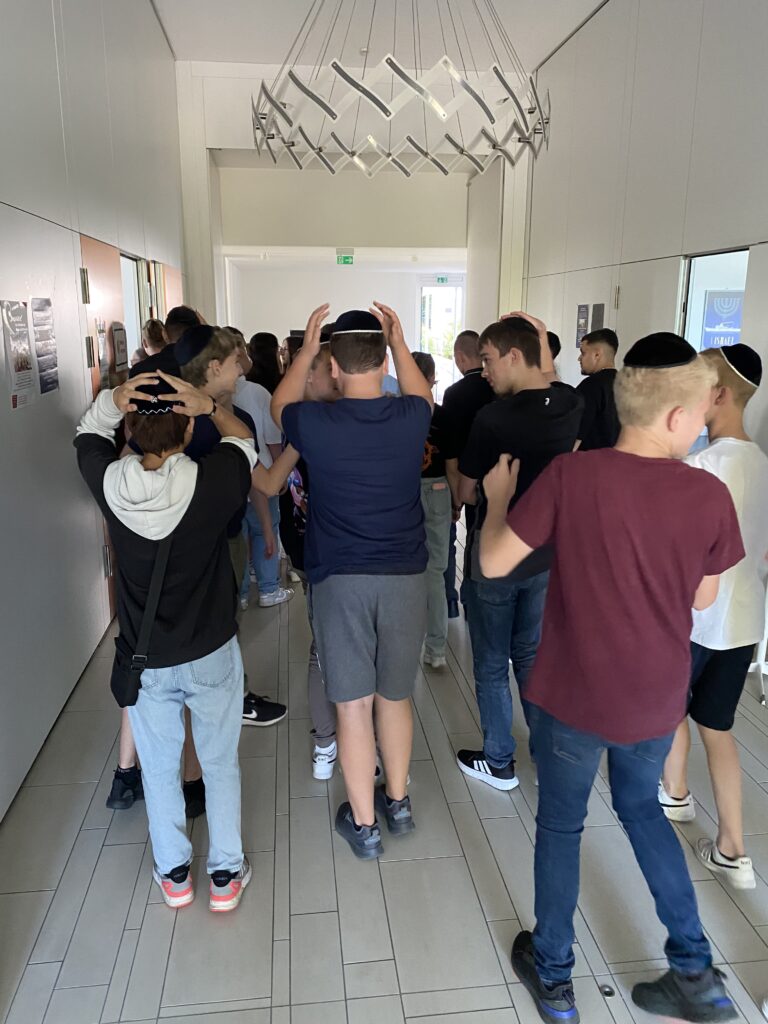 Am 05.09.23 war es soweit: Nach der Ankunft wurden die 95 Schülerinnen und Schüler und 5 Lehrer im Foyer von Frau Moor im Foyer begrüßt. Die Jungen durften sich eine Kippa aufsetzen, bevor es in die Synagoge ging.