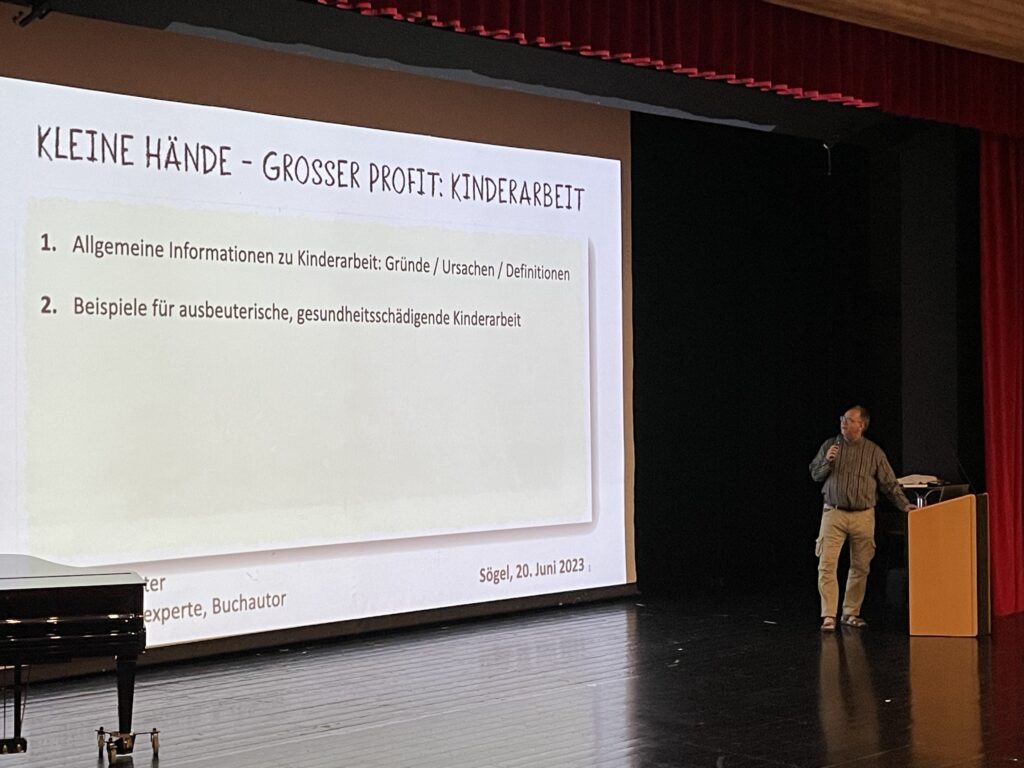 Am Dienstag, den 20. Juni 2023 fand für die Schülerinnen und Schüler der Klassen 6-10 ein Vortrag zum Thema „Kinderarbeit in Indien“ statt. Der evangelische Theologe Benjamin Pütter berichtete über das harte Leben von Millionen Kindern, die in Indien unter unwürdigsten Bedingungen „für unsere Konsumprodukte, wie zum Beispiel für Schmuck, Teppiche und Natursteine schuften und ausgebeutet werden, obwohl Kinderarbeit international verboten ist.“