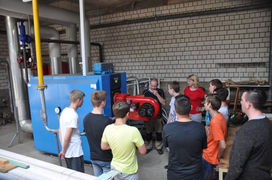 Das Foto zeigt die SchülerInnen des WKP´s Physik mit Lehrerin Rita Fortwengel und Hausmeister Eduard Engel an der Heizungsanlage