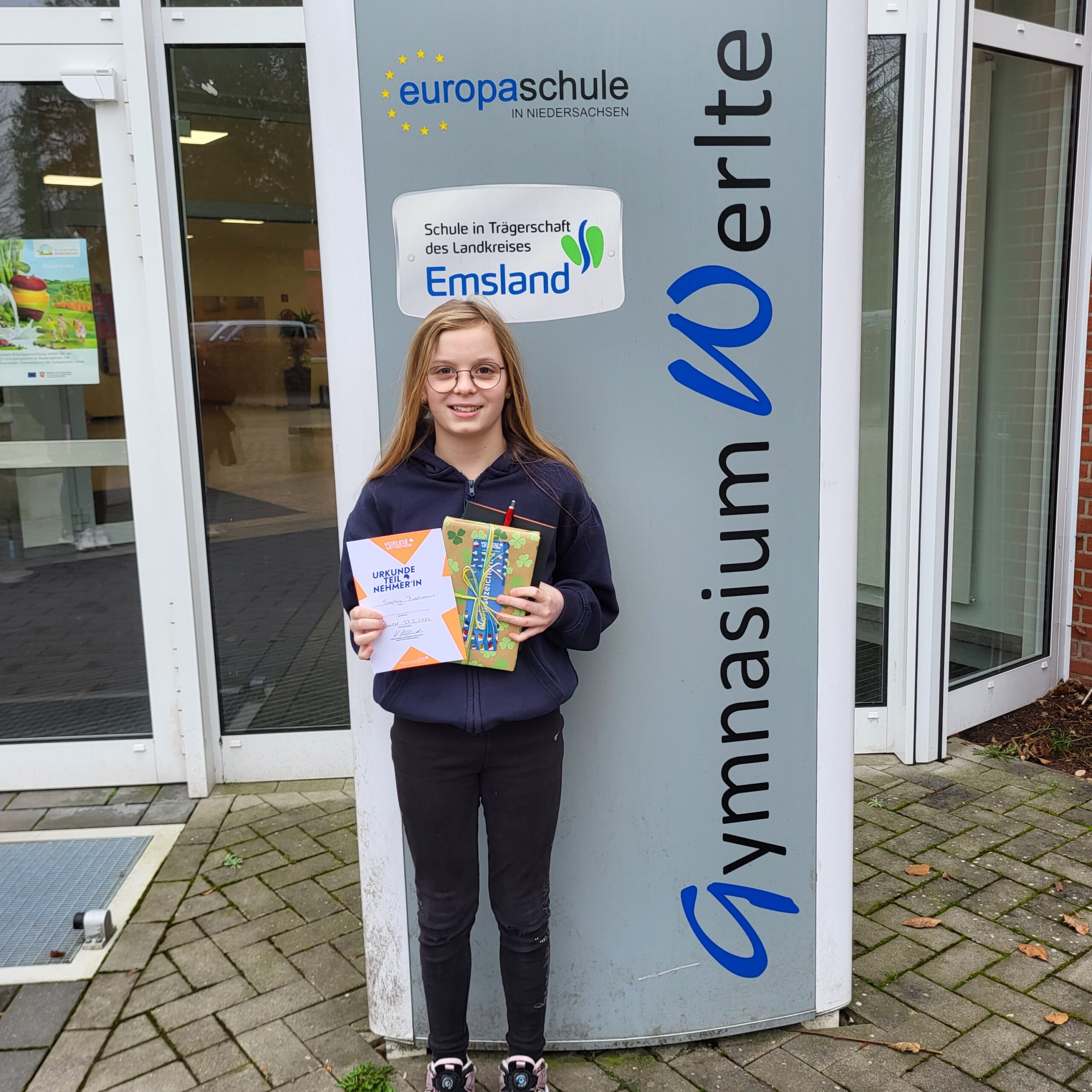 Am 27. Februar 2024 fand am Schulzentrum Werlte der Vorlesewettbewerb (Kreisentscheid) statt. Unsere Schule wurde erfolgreich vertreten durch Sophia Buschmann (Klasse 6a), die Anfang Dezember 2023 zur Schulsiegerin gekürt wurde. Alle sieben TeilnehmerInnen lasen einen selbstgewählten und einen fremden Text und erhielten als Anerkennung eine Urkunde, ein Notizheft mit Kugelschreiber sowie ein Buch.