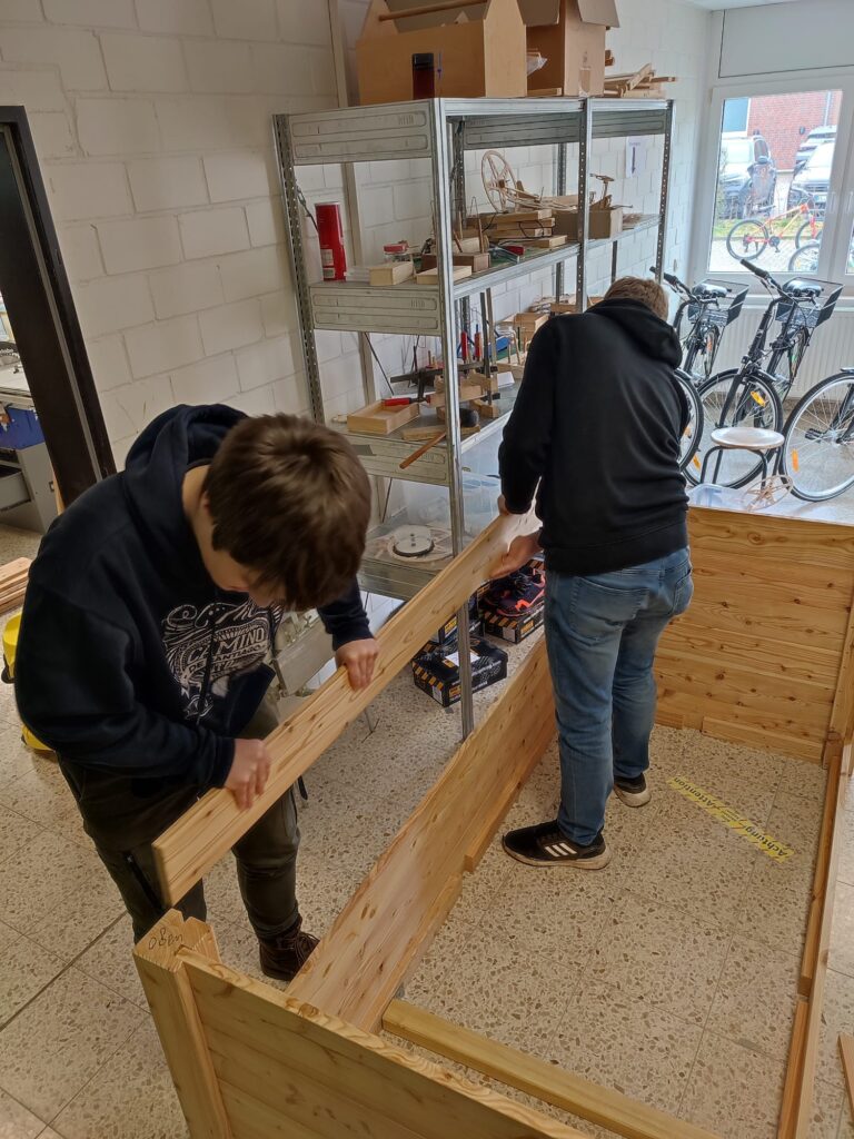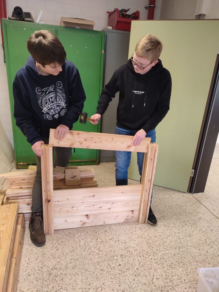 Im Rahmen eines BNE-Projektes (Bildung für nachhaltige Entwicklung) werden im Schulgarten zwei Hochbeete angelegt. Die Bausatze wurden von SchülerInnen der Klasse 9 und 10 im WPK Technik zusammengebaut.