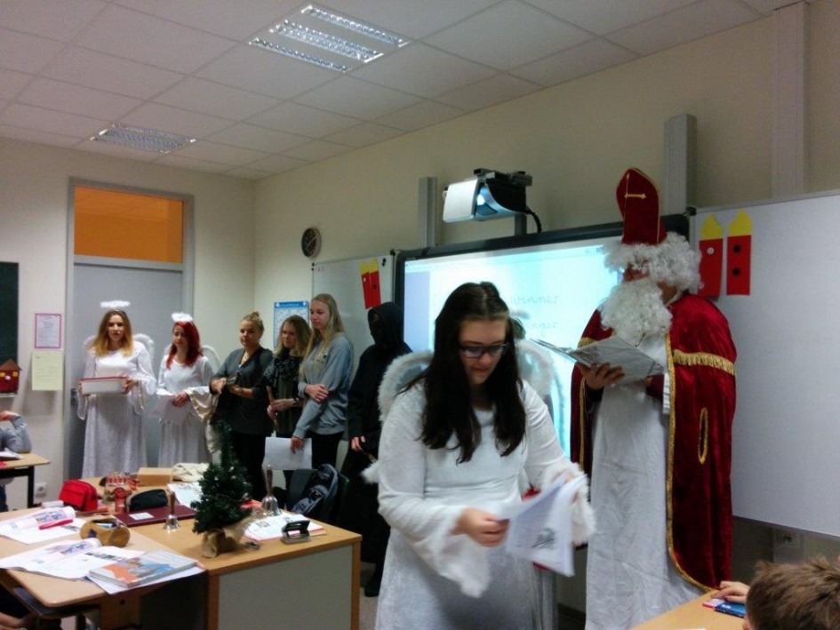Auch in diesem Jahr schlüpften wieder zahlreiche SV-Mitglieder der Oberschule Sögel unter der Leitung von Verena Albers in ein Nikolaus bzw. Engelskostüm, um traditionsgemäß durch die Klassen zu gehen. Bei dieser beliebten Aktion durfte natürlich auch der Knecht Ruprecht nicht fehlen. Die braven und fleißigen SchülerInnen hatten dabei nichts zu befürchten, sie wurden ausgiebig gelobt und angehalten, genauso weiter zu machen, um ihr Ziel zu erreichen. Nur hin und wieder gab es dann doch einen Tadel auszusprechen, und die betroffenen SchülerInnen mussten zur Strafe ein Gedicht aufsagen oder ein Lied vorsingen. Groß war die Freude auch bei den lernbehinderten Schülern und Schülerinnen der Tabi, als die Nikolaus-Gruppe sie überraschte. Bei der Aktion wurden bekannte Nikolauslieder gesungen, die einige Engel auf der Gitarre und Flöte begleiteten. Ebenfalls verteilten sie selbstgebackene Plätzchen und Lutscher. Einige Schüler und Schülerinnen und sogar Schulleiterin Maria Lau trauten sich, dem ehrfürchtigen Nikolaus ein Gedicht aufzusagen.