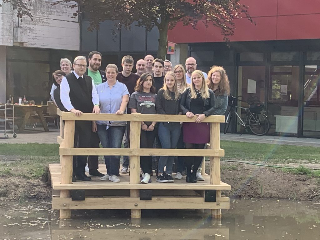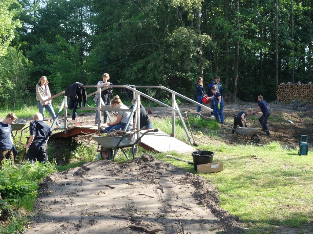 Während der Aktion waren die Schüler und Lehrer am Biotop dann damit beschäftigt, den Uferbereich zu verfestigen und neue Wasserpflanzen zu setzen. Im Anschluss daran wurde die vorhandene Teichbrücke frisch gestrichen und eine Steganlage angefertigt.Der Mutterboden musste in schweißtreibender Arbeit mit Schubkarren verfahren und eingeebnet werden, bevor Grassamen eingesät und der Boden mit einer Walze verfestigt werden konnte. Abschließend wurde das Biotop dann mit Wasser gefüllt.