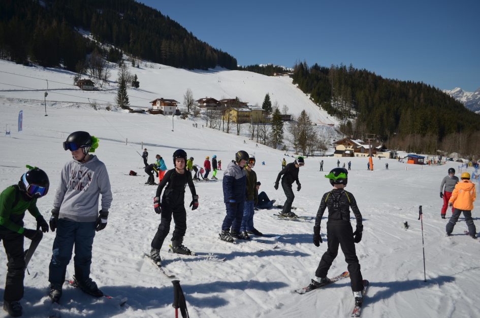 Am nächsten Morgen fuhr die Gruppe bei schönstem Sonnenschein mit dem Skibus ins Skigebiet, um dort von den einheimischen Skilehrern in den grundlegenden Fertigkeiten des Skifahrens unterrichtet zu werden. Trotz der fortgeschrittenen Saison waren die Schneeverhältnisse vor allem am Vormittag sehr gut.