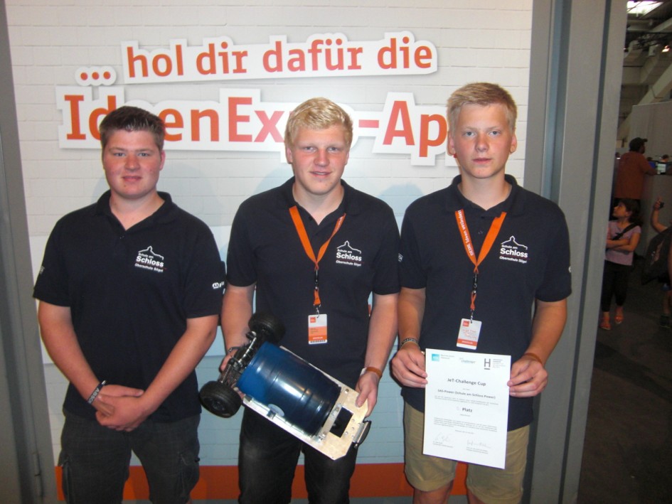 | Zuvor waren sie mit ihrem Techniklehrer Uwe Hoormann bereits zur Ideenexpo nach Hannover gefahren, um ihr selbst konstruiertes, dreirädriges Fahrzeug einer Fachjury und einem Publikum zu präsentieren. Nun musste das fahrerische Können unter Beweis gestellt werden, da beim „JeT-Challenge Cup“ die Fahrzeuge in einem Rennen gegeneinander angetreten sind. |