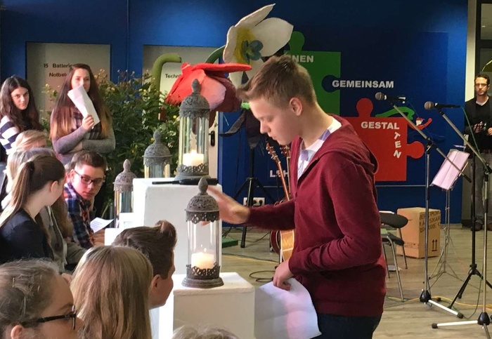 | Zwei weitere Schüler berichteten in rumänischer und russischer Sprache, die von ihren Mitschülern synchron ins Deutsche übersetzt wurden, von den Flüchtlingserfahrungen ihrer Familien. Als Erinnerung an die Opfer der Familien Eichenwald, Hesse und Jacobs wurden von den Schülern Kerzen angezündet. Außerdem gab es eine Gedenkminute. |