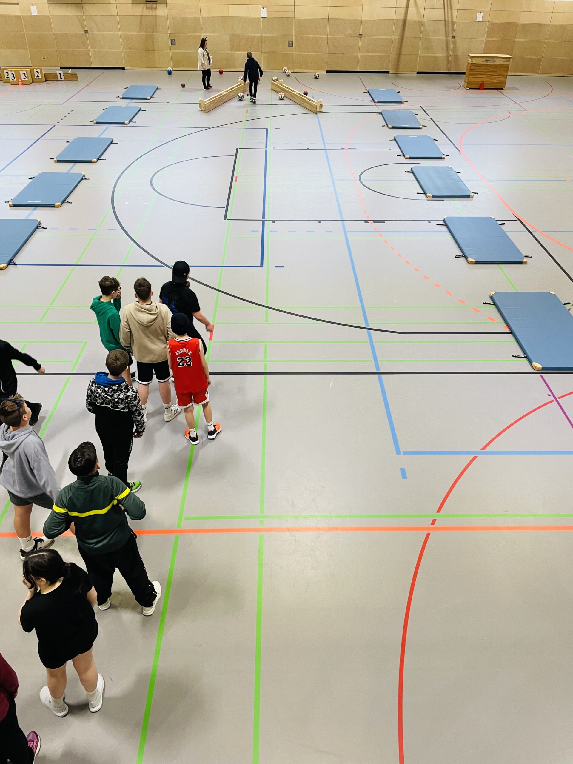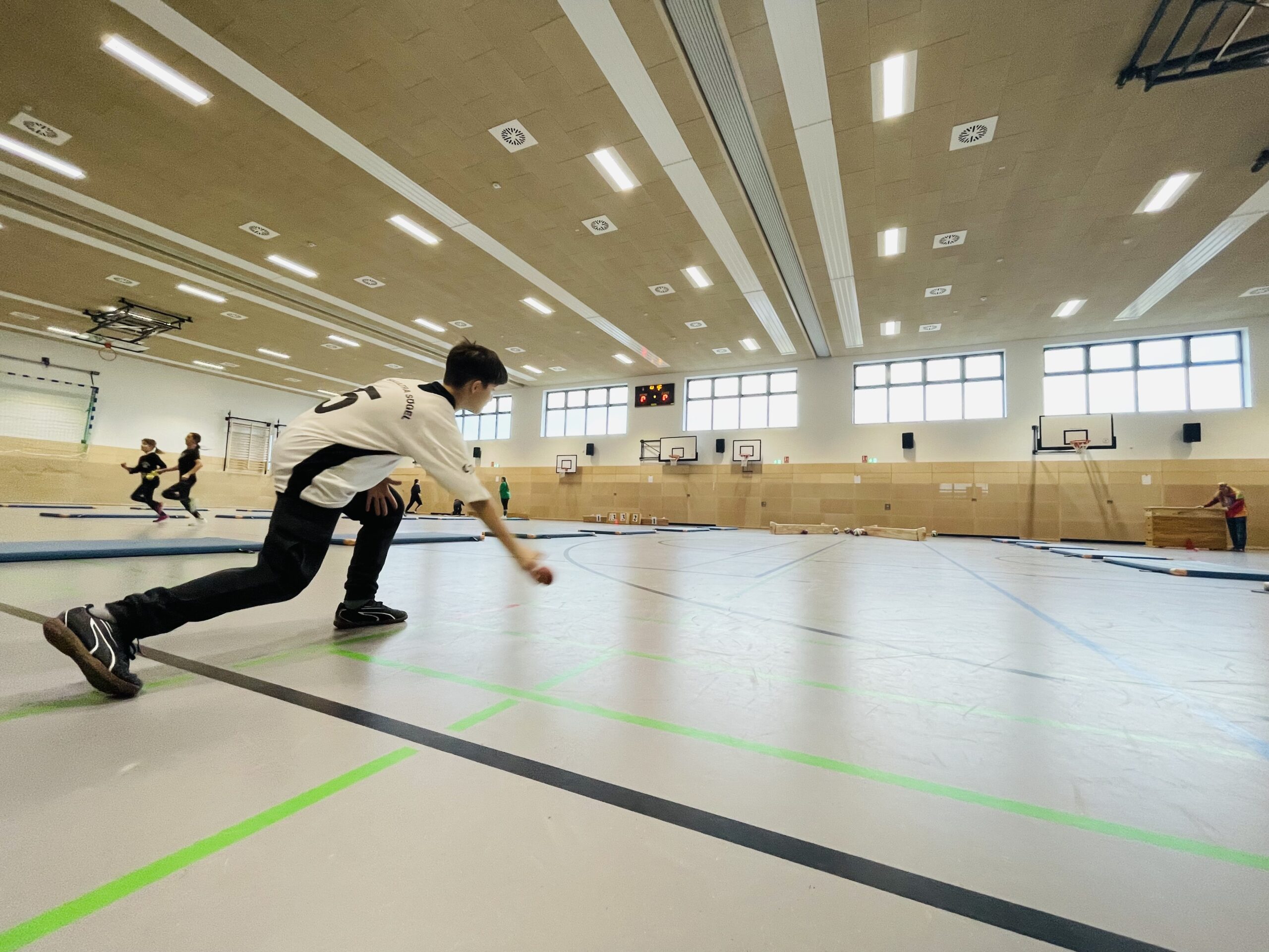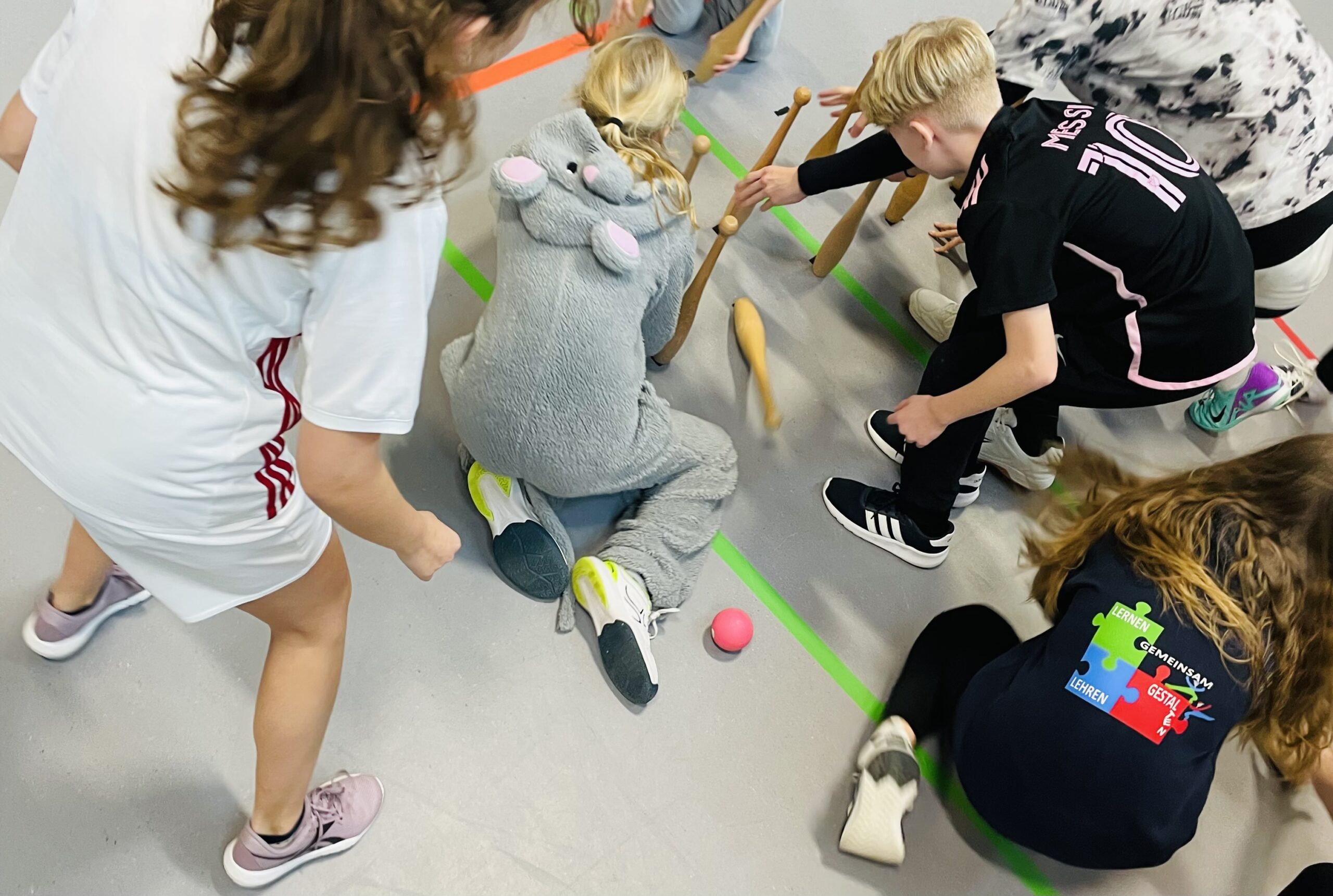 Traditionell traten heute die Klassen 5 – 7 der Oberschule Sögel in der Großraumturnhalle gegeneinander an. Mit hoher Geschwindigkeit und Präzision versuchten die bunt verkleideten SchülerInnen Punkt um Punkt zu sammeln. Auf 5 verschiedenen Bahnen wurden Kegel, Bälle, Kästen und Pylonen getroffen.